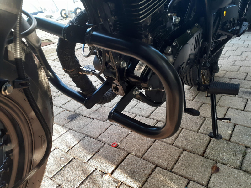Dieser Schutzbügel (Beinschutz und Motorschutz) spielt bei einem Unfall oder Sturz eine wesentliche Rolle. Durch die Verringerung der Neigung des Motorrads zum Boden werden nicht nur der Motor, sondern auch die Verkleidung, der Tank und das Zubehör geschont und so kostspielige Reparaturen vermieden.